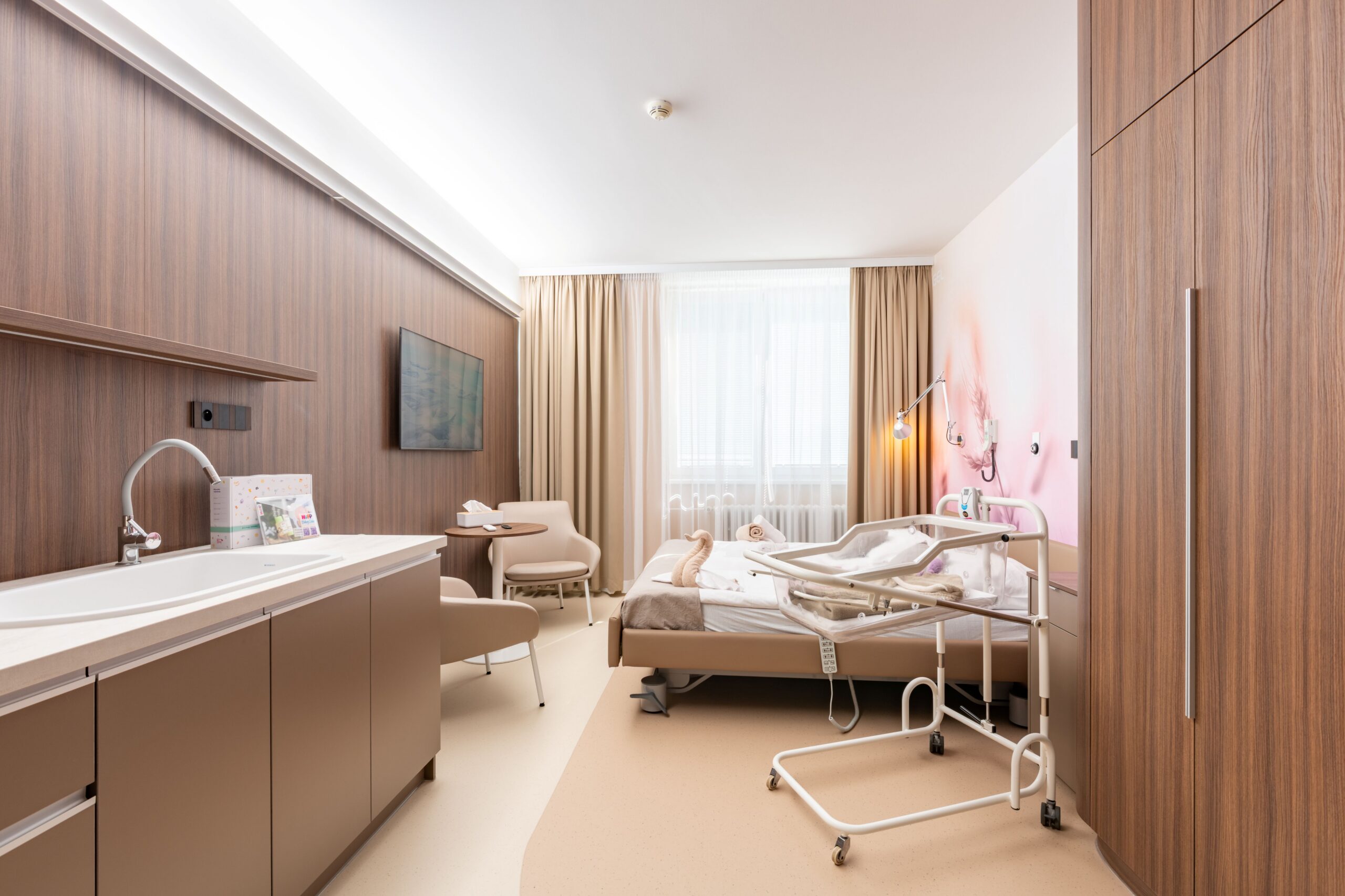 V prostoru oddělení šestinedělí máme k dispozici také rodinný pokoj, který umožňuje pobyt i pro doprovázející osobu.